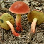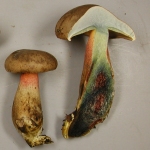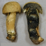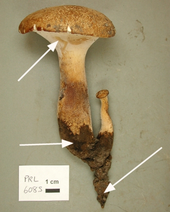 (gills running down stem, black stem base, stem rooting underground)
